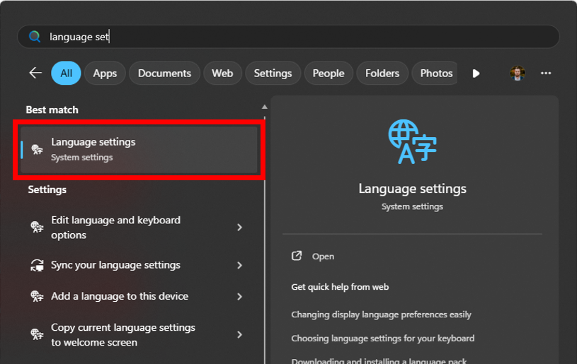 Nadat het Windows menu is geopend type je “taal instellingen” of “language settings”. Je zou nu ongeveer het volgende moeten zien. Klik vervolgens op “taal instellingen”.