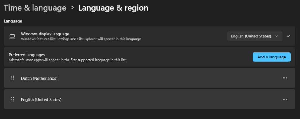 Power Automate Desktop selecteert de taal die in het rijtje met “preferred languages” (voorkeurstalen) bovenaan staat. Als er maar één taal staat kun je een andere taal (bijvoorbeeld Engels) toevoegen.