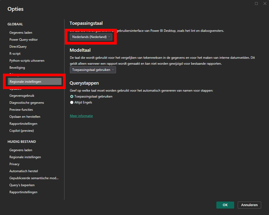 Nu opent onderstaand venster. In het menu, onder “globaal” klik je op “regionale instellingen”. Vervolgens kun je de toepassingstaal veranderen. De toepassingstaal is de taal die wordt gebruikt in Power BI (bijvoorbeeld in menu’s enzo). De modeltaal wordt gebruikt voor het vergelijken van teksten en voor interne datumvulden.
